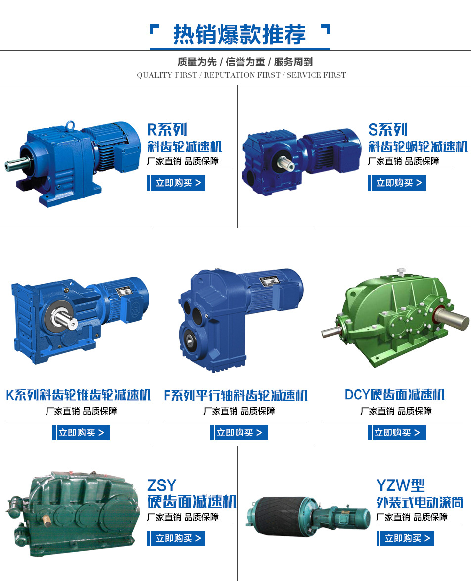 我廠主打產(chǎn)品為R、S、K、F系列斜齒輪減速機,ZSY、ZLYJ、ZD重型齒輪減速機,B、X系列擺線針輪減速機,WP、NMRV蝸輪蝸桿減速機,P系列行星減速機,TDY電滾筒及各種非標減速機.廣泛應(yīng)用于制金.包裝,紡織,塑料機械,化工.電工機械等眾多行業(yè)。